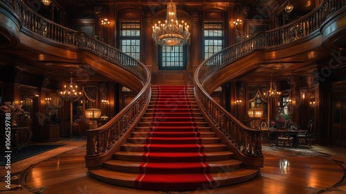 © Soulin7, Fototapeta premium Grand staircase with plush red carpet, polished wood steps, and a chandelier.