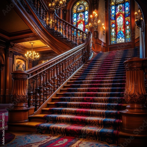 © tanawatbig, Obraz premium Grand Staircase with Stained Glass Windows