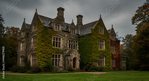 © Pipin, Obraz premium Grand Stone Manor House Enveloped in Vibrant Ivy Under an Overcast Sky
