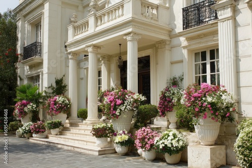 © Zahida, Fototapeta premium Grand white mansion entrance, adorned with vibrant flower planters