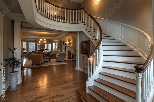 © Shrikant, Obraz premium Grand White Wooden Staircase with Elegant Banister and Railing in Luxury Interior