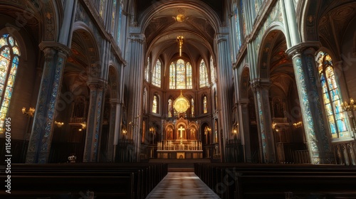 © KOOLAIDMAN100X, Fototapeta premium Grandiose church interior, stained glass
