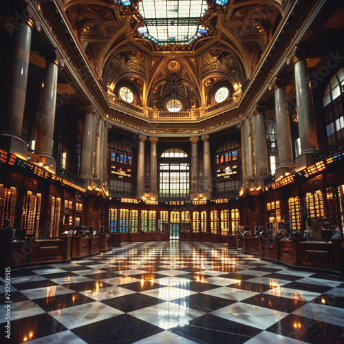 © Nano Photos, Obraz premium Grandiose interior of a historic building with ornate ceilings, stained glass windows, and a checkerboard floor pattern, likely a stock exchange.