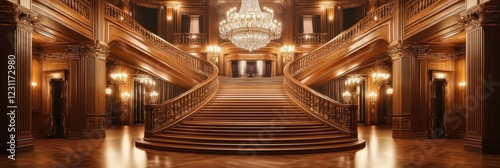 © Anisah, Obraz premium Grandiose Wooden Staircase in Opulent Mansion