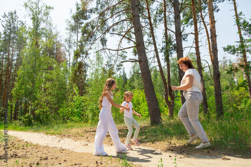 © Mariia, Fototapeta premium Grandmother and granddaughters having fun and dancing outdoors in the forest in summer