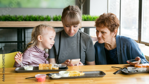 Fototapeta premium Grandmother, daughter and granddaughter with a phone in a cafe. Three...