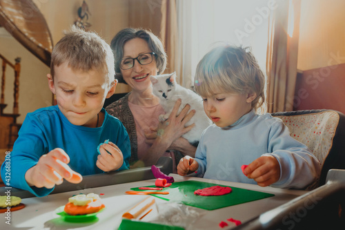 Fototapeta premium Grandmother playing with her grandchildren with kids play clay