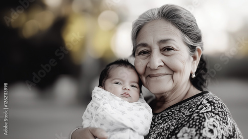 Obraz premium Grandmother Smiling with Newborn Granddaughter in the Park A heartwarming moment captured in the park as a grandmother smiles lovingly at her newborn granddaughter. The peaceful ou