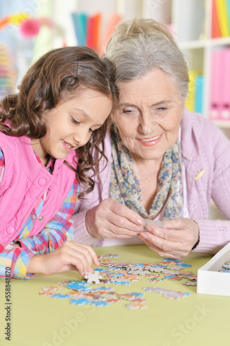 Fototapeta premium Grandmother with granddaughter collecting puzzle at home