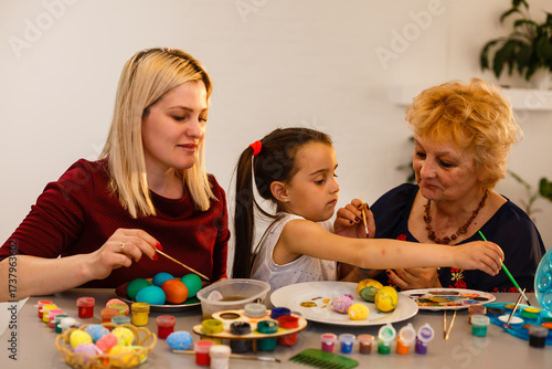 Fototapeta premium grandmother with granddaughter play with easter eggs, easter time to paint eggs.
