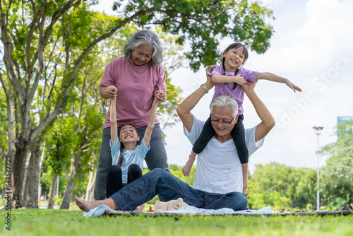 © jittawit.21, Obraz premium Grandparents let their granddaughter sit on their shoulder in the park. People of different generations laugh happily in the park on the mats.