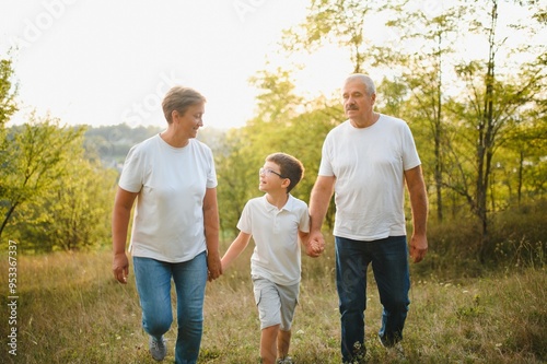 Fototapeta premium Grandparents walking with they grandson in summer sunset