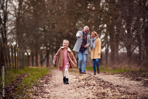 Fototapeta premium Grandparents With Granddaughter Outside Walking Through Winter Countryside