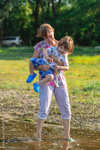 © Наталья Новикова, Fototapeta premium Grandson and grandmother playing on the river bank