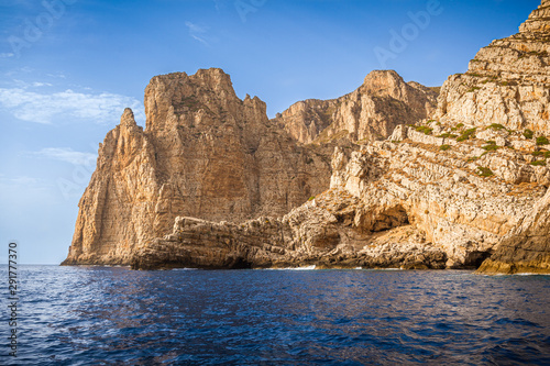 © Maurizio De Mattei, Fototapeta premium Granite cliffs in front of Bombarda Cave, Marettimo, Egadi Islands, Italy