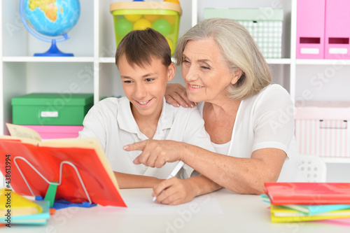 © aletia2011, Fototapeta premium Granny with her grandson doing homework at home