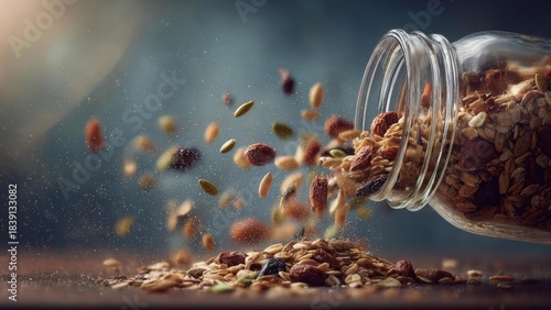 Fototapeta premium Granola spills from a glass jar, with oats, seeds and dried fruit scattering onto a surface. Concept Granola spill from glass jar, Oats, seeds and dried fruit scattering on surface