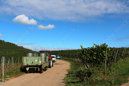 © Ines Porada, Fototapeta premium Grape harvest in the vineyard on a sunny day (Kaiserstuhl, Germany)