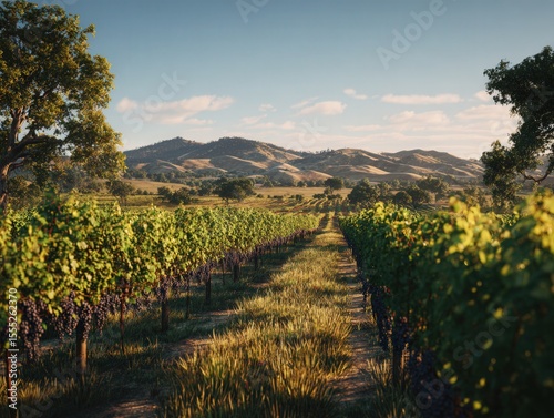 Naklejka premium Grape vineyard under sunny sky in countryside. Lush green vineyard with ripe...