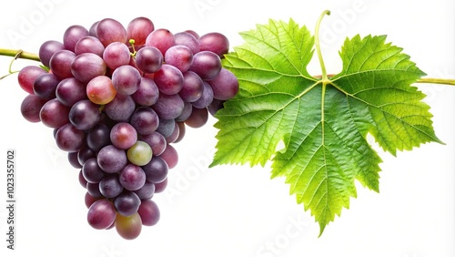 Obraz premium Grapes and green leaf hanging from vine on white background