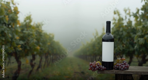 © vxnaghiyev, Obraz premium Grapes and wine bottle captured in foggy vineyard setting with blank copy space