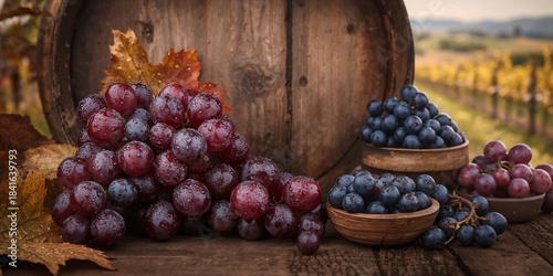 Fototapeta premium Grapes arranged on a table near an aged wine barrel and dishes, highlighting harvest activities, Earth Day