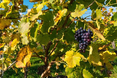 Fototapeta premium Grapes Fruits Closeup Vineyard Fall Leaves Autumn Farming Agriculture Wine...