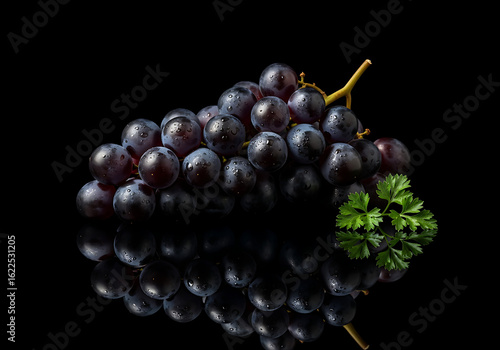 © Maik, Fototapeta premium Grapes Glisten with Parsley Sprig on Dark Reflective Surface