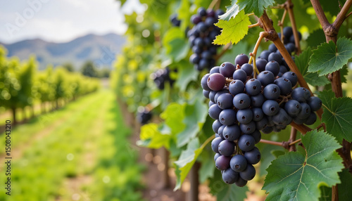 © AIRina, Obraz premium Grapes growing on vines in vineyard under sunny sky