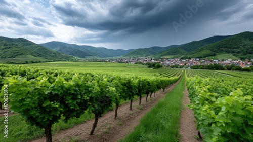 Naklejka premium Grapes hang on vines in a Black Forest vineyard overlooking a small town, surrounded by green grass and blueberries under cloudy skies