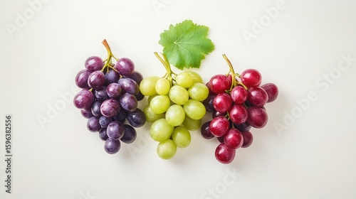 Fototapeta premium Grapes in contrasting colors--emerald green, rich red, and dark purple--styled neatly on white surface for a crisp fruit layout