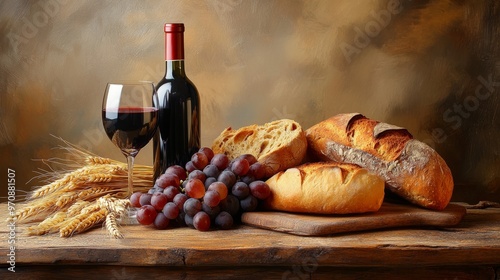Naklejka premium Grapes wheat bread and wine in a wood table