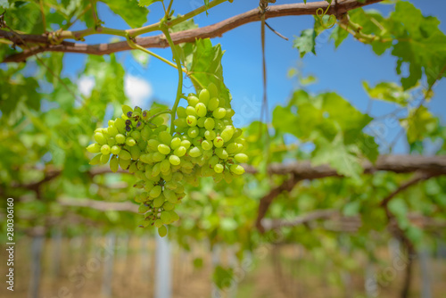 © tuiafalken, Fototapeta premium grapes with green leaves on the vine. fresh fruits