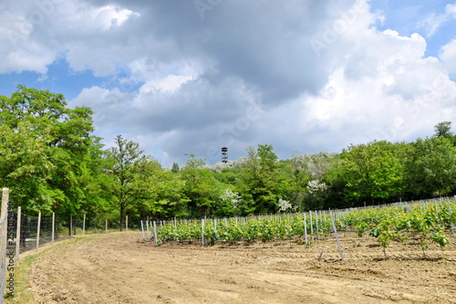 © KikkiaJackson, Fototapeta premium Grapevine in a Row Field Stock Photo