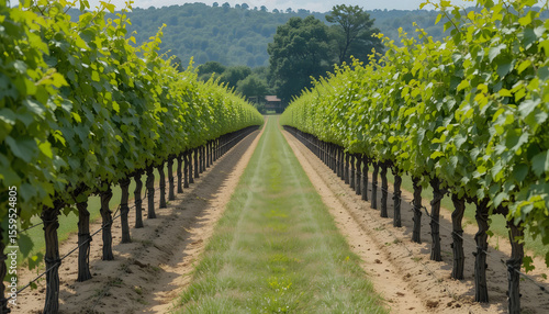 © Anvesh, Naklejka premium Grapevine Rows in Lush Vineyard with Hill View – Scenic Agricultural Landscape