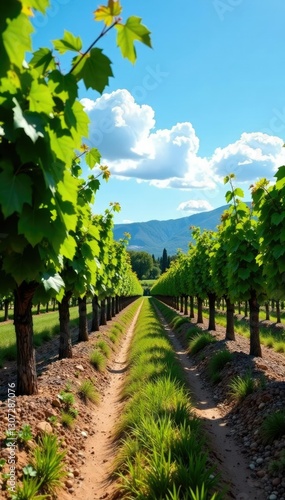 Obraz premium Grapevines and olive trees under sunny blue sky, leaves, vineyard, rustic