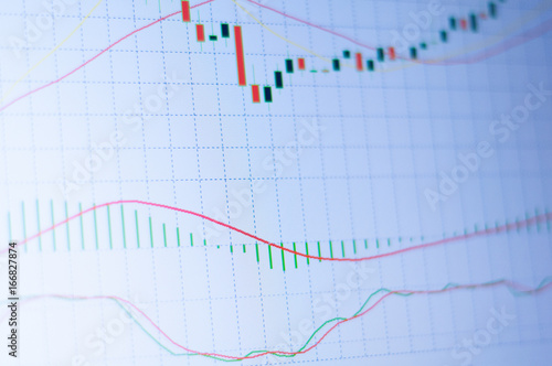 © OlekStock, Naklejka premium Graph of candle chart of stock market on digital display