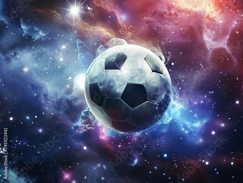 Fototapeta premium Graphic arts representation of a soccer ball in a cosmic setting for banner,...