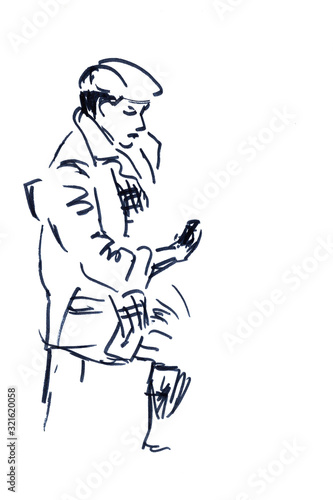 © Natalia, Fototapeta premium Graphic black and white drawing of a sitting man with a phone