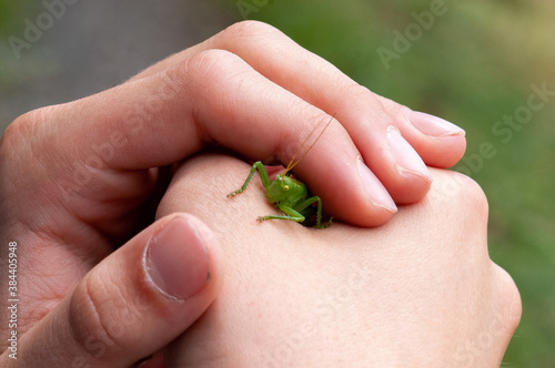 © reliant_de, Obraz premium Grashüpfer schaut aus einer Kinderhand hervor