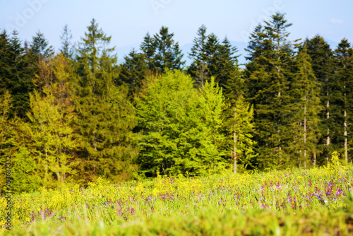 © Pellinni, Fototapeta premium grass and herbs on the glade in morning light. natural park background. spring season in carpathian mountains