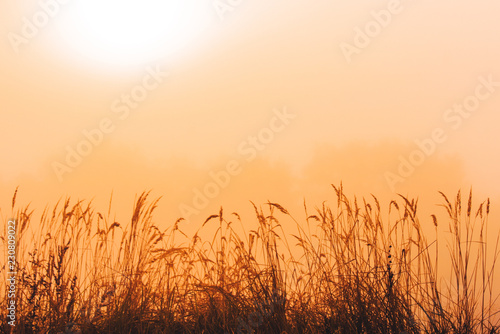 Fototapeta premium Grass and orange morning mist, wallpaper or background, edit space