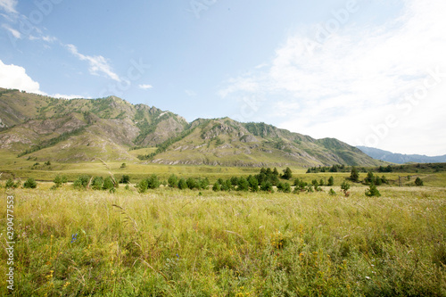 Naklejka premium grass field in the Katun river valley, Chemal district, Altai Republic, month of August