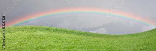 Naklejka premium Grass Field with Rainbow in the Sky.