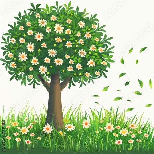 © Cheetose, Fototapeta premium Grass, flowers and a tree on a simple background.
