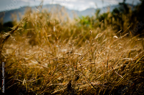 Obraz premium Grass flowers on mountain warm color tone during mid day. Blurred background...