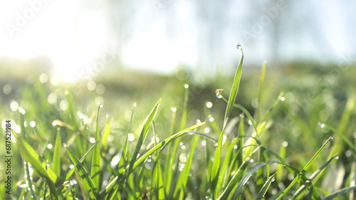 Fototapeta premium Grass. Fresh green spring grass with dew drops closeup. Soft focus. Abstract...