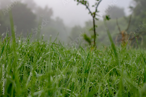 © PhotoChur, Fototapeta premium Grass in the dew early foggy morning