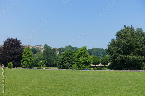 © 1000 Words, Naklejka premium Grass lawn and leafy trees in a park