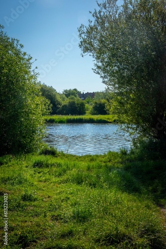 © Anthony, Fototapeta premium Grass leading to river with tress framing either side-001